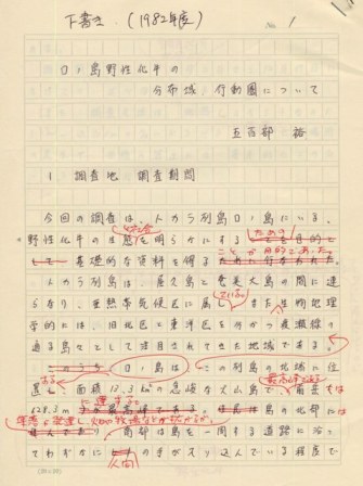 さて今回この文章を書くにあたって、25年以上前の資料を引っ張り出していろいろ調べてみた。そこで驚いたことが三つ。まずは当時のフィールドノートに「何も書かれていなかった」こと。学部生とはいえ本当にいい加減なノートを書いていたものだ。二つ目は伊谷さんの指導力。課題研究の発表会の際の手書き原稿が出てきたのだが、その最初の稿に、あの懐かしい字体でびっしりと赤い書き込みがあった。たかが学部生の発表会の原稿にも、丁寧に目を通してくれていたことに今更ながら感激するとともに、学生のレポートに手抜きのコメントしか書けない自分が恥ずかしくなった。そして最後は俳句(?)。何も書かれていないフィールドノートの片隅に、川柳とすら呼ぶことができないような自作の「句」が書かれていた。たぶん口之島で俳句を詠んでいた伊谷さんに触発されて自分なりに考えたのだろう。蛇足を承知で、伊谷さん追悼の思いを込めて、この句でこの原稿を終わりにしたい。